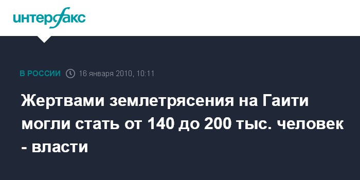 Вашингтон/Оттава. 16 января. ИНТЕРФАКС - Жертвами разрушительного землетрясения, произошедшего в Гаити 13 января, стали, по меньшей мере, 140 тыс. человек, сообщает газета "Интернешнл бизнес таймс" со ссылкой на заявление госсекретаря по общественной безопасности правительства Гаити Арамика Луиса.