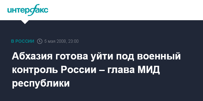Москва. 5 мая. ИНТЕРФАКС - Абхазия готова отдать свою территорию под военный контроль России взамен гарантий своей безопасности, заявляет глава МИД Абхазии Сергей Шамба.