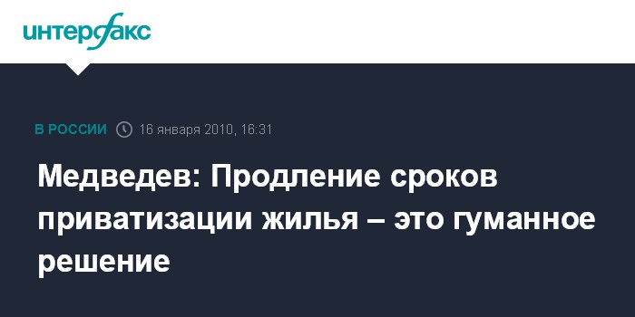Завидово. 16 января. INTERFAX.RU - Президент России Дмитрий Медведев назвал важным решение о продлении в России сроков бесплатной приватизации жилых помещений. Об этом он заявил на встрече с лидерами парламентских партий в загородной резиденции "Завидово". Председатель Высшего совета "Единой России" Борис Грызлов отметил, что с начала года Госдума приняла уже ряд важных законов, в том числе о продлении срока приватизации жилых помещений для граждан РФ. "Это человеческое решение, абсолютно. Об этом меня неоднократно просили, и партии обращались", - сказал Д.Медведев. "Мы приняли этот закон в первом чтении и в целом, и мы его уже передаем в Совет Федерации", - отметил спикер Госдумы.