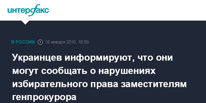 Киев. 16 января. INTERFAX.RU - В субботу, 16 января, и непосредственно в день выборов, 17 января, о резонансных фактах нарушения избирательного законодательства можно сообщить заместителям генерального прокурора Украины.
