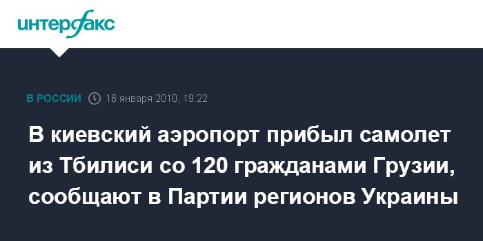 Киев. 16 января. ИНТЕРФАКС-УКРАИНА - В международный аэропорт "Борисполь" в субботу прибыл самолет грузинских авиалиний со 120 пассажирами на борту, сообщила агентству "Интерфакс-Украина" народный депутат Елена Бондаренко (Партия регионов).