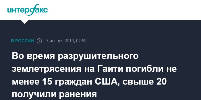 Лондон. 17 января. ИНТЕРФАКС - На Гаити в результате разрушительного землетрясения погибло не менее 15 американских граждан, сообщила в субботу вечером британская корпорация Би-би-си со ссылкой на представителей госдепартамента США.