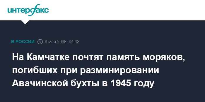 Петропавловск-Камчатский. 6 мая. ИНТЕРФАКС-ДАЛЬНИЙ ВОСТОК - Память моряков, погибших у берегов Камчатки в годы Второй мировой войны, почтят во вторник военнослужащие Тихоокеанского флота.