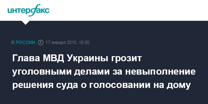 Киев. 17 января. ИНТЕРФАКС-УКРАИНА - Министр внутренних дел Украины Юрий Луценко предупреждает об уголовной ответственности за невыполнение судебных решений, в частности двух решений Киевского административного апелляционного суда - о голосовании на дому исключительно при наличии соответствующих медицинских документов и о невозможности внесения изменений в реестр избирателей в день голосования. Глава МВД на брифинге в воскресенье в Киеве продемонстрировал оба решения суда и обратился к руководителям и членам избирательных участков с просьбой выполнять решения суда.