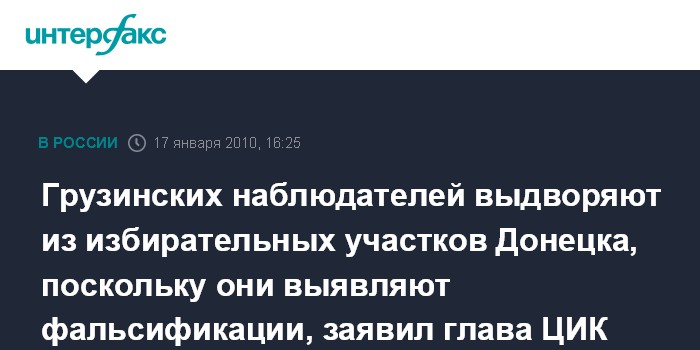 Киев. 17 января. INTERFAX.RU - В украинском Донецке грузинских наблюдателей на президентских выборах выгоняют из избирательных участков и задерживают, поскольку они фиксируют факты фальсификаций при голосовании, утверждает председатель Центральной избирательной комиссии Грузии Леван Тархнишвили. Заявление главы ЦИК Грузии обнародовано в воскресенье пресс-службой БЮТ.
