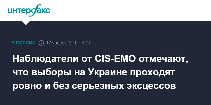 Киев. 17 января. INTERFAX.RU - Наблюдатели от Международной организации по наблюдению за выборами CIS-EMO констатируют спокойный ход избирательного процесса на Украине.