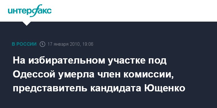 Одесса. 17 января. INTERFAX.RU - В Одесской области Украины умерла член избирательной комиссии. Трагедия произошла на избирательном участке N128 территориального избирательного округа N141, расположенного в селе Свердлово Коминтерновского района. Как сообщил агентству "Интерфакс-Украина" в воскресенье один из наблюдателей на участке, попросивший не называть его фамилию, женщина представляла кандидата в президенты Виктора Ющенко. По словам очевидца произошедшего, экстренная помощь женщине, оказанная окружающими, не принесла результатов, а вызванная на участок "скорая помощь" не успела прибыть по вызову.