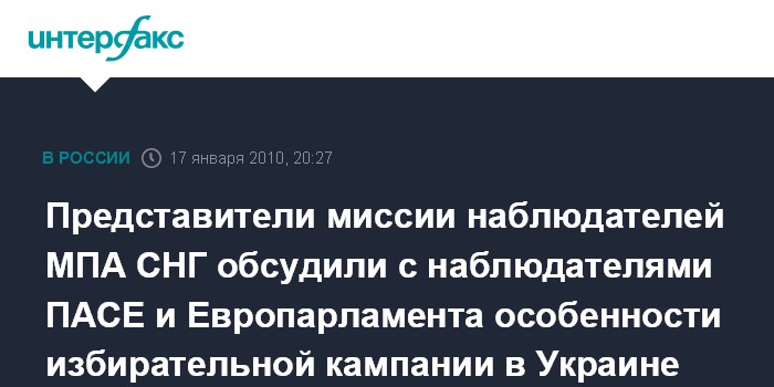 По информации пресс-службы, 16 января в Киеве руководитель миссии международных наблюдателей МПА СНГ на выборах президента Украины, первый заместитель председателя Совета Федерации Федерального Совета Российской Федерации Александр Торшин и члены миссии - председатель комитета Совета Федерации по делам СНГ Андрей Молчанов, Генеральный Секретарь Совета МПА СНГ Михаил Кротов - встретились с руководителем миссии ПА ОБСЕ - председателем ПА ОБСЕ Жоао Соарешем и Генеральным Секретарем ПА ОБСЕ Спенсером Оливером.