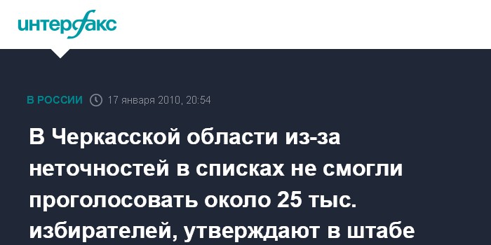 Черкассы. 17 января. INTERFAX.RU - В Черкасской области из-за неточностей в списках избирателей не смогли проголосовать как минимум 25 тысяч избирателей, констатируют в областном избирательном штабе Партии регионов.