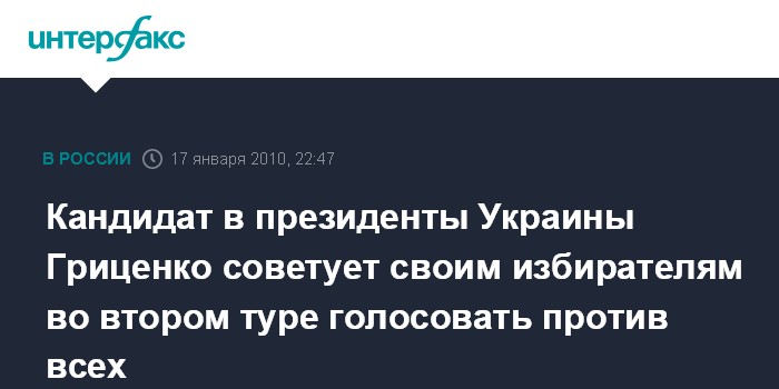 Киев. 17 января. INTERFAX.RU - Кандидат в президенты, народный депутат Анатолий Гриценко во втором туре проголосует против лидеров первого тура Виктора Януковича и Юлии Тимошенко, и советует сделать так же своим избирателям. "Я лично вычеркну две фамилии. Я советовал бы им (своим избирателям - ИФ) сделать то же самое", - сказал он в эфире программы "Шустер Live" в воскресение. А.Гриценко пояснил, что оба этих кандидата были у власти, и "откаты те же самые, коррупция та же самая". "Ясно, что страна летит в штопор далее. Ни один из них справиться с ним не сможет", - добавил кандидат в президенты, подчеркнув, что не пойдет в правительство ни одного из них. Он выразил надежду, чтобы В.Януковичу и Ю.Тимошенко хватило здравого смысла признать победу, и дать шанс идеям, которые высказывали другие кандидаты, набравшие достаточно много голосов. Комментируя свой результат, а согласно данным экзит-полов он получил около 1,3-1,5% и занял 9 место, А.Гриценко отметил, что он доволен результатом. "Иллюзий не было. Хочу поблагодарить около 0,5 млн. избирателей, меня поддержавших. Он достаточен для того, чтобы двигаться вперед. Я с детства стайер, поэтому знаю, что дистанция будет полной", - сказал кандидат. Он отметил, если бы у него было в сотни раз больше средств, как у других кандидатов, его результат мог быть лучше. По его мнению, было бы странно, чтобы кто-то их новых кандидатов сразу вышел во второй тур, однако первым двум кандидатам нужно знать отношение избирателей к их политике.