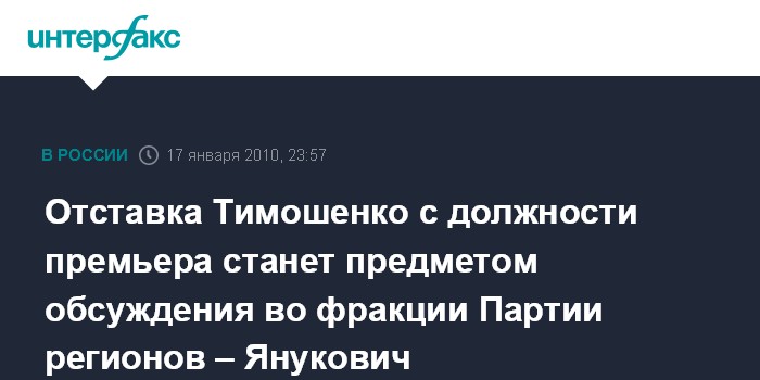Киев. 17 января. INTERFAX.RU - Вопрос отставки Юлии Тимошенко с должности премьер-министра станет предметом обсуждения во фракции Партии регионов, заявляет кандидат на пост президента Украины, лидер партии Виктор Янукович.
