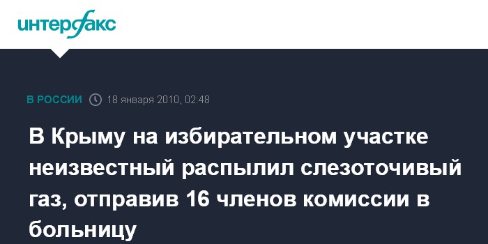 Симферополь. 18 января. ИНТЕРФАКС-УКРАИНА - В Крыму в городе Красноперекопск на участковой избирательной комиссии #15 территориального округа #9 во время подведения итогов голосования неизвестный распылил слезоточивый газ, в результате чего 16 членов избиркома попали в больницу.