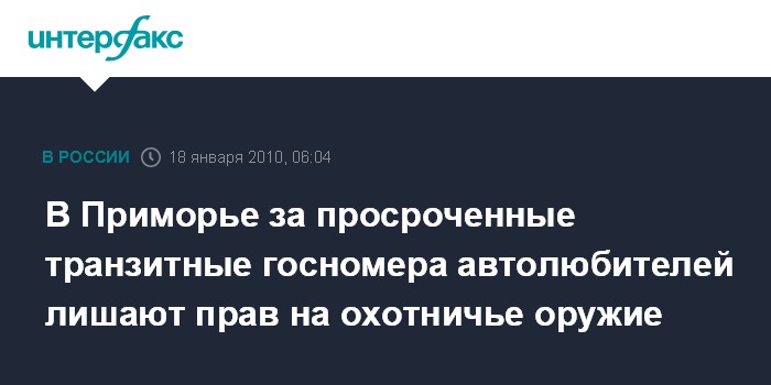 Владивосток. 18 января. ИНТЕРФАКС - ДАЛЬНИЙ ВОСТОК - Борба с автовладельцами в Приморье, которые предпочитают ездить с транзитными госномерами, продолжается, за два штрафа такой водитель может лишиться лицензии на охотничье оружие.