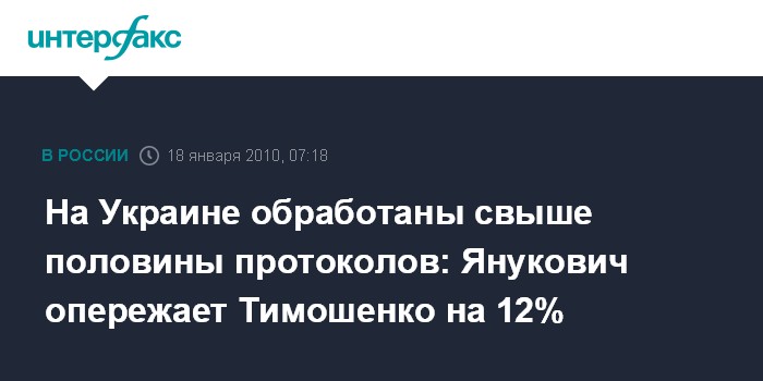Киев. 18 января. ИНТЕРФАКС-УКРАИНА - По данным обработки 50,37% протоколов участковых избирательных комиссий, за Виктора Януковича в первом туре президентских выборов проголосовали 36,86% избирателей, за Юлию Тимошенко - 24,31%.
