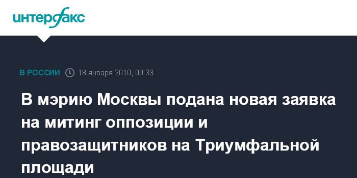 Москва. 18 января. INTERFAX.RU – Активисты оппозиционных и правозащитных организаций в понедельник утром подали в мэрию Москвы заявку на проведение 31 января на Триумфальной площади митинга в защиту Конституции.