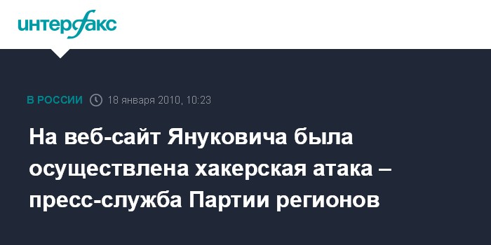 Москва. 18 января. INTERFAX.RU – Около 23:30 17 января на веб-сайт лидера Партии регионов Виктора Януковича была осуществлена DDOS-атака, сообщает пресс-служба партии в понедельник.