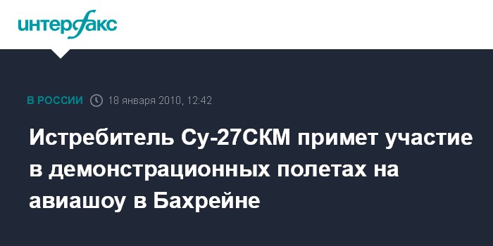 Москва. 18 января. INTERFAX.RU - Одной из изюминок открывающейся в четверг в Королевстве Бахрейн первой международной аэрокосмической выставки Bahrain International Airshow (BIAS) 2010 станут демонстрационные полеты российского истребителя Су-27СКМ. "Программой участия в авиасалоне в Бахрейне предусмотрены демонстрационные полеты модернизированного истребителя Су-27СКМ, проведение деловых встреч, презентаций и переговоров с потенциальными покупателями российской боевой и гражданской авиационной техники", - говорится в сообщении компании "Сухой", поступившем в "Интерфакс" в понедельник.