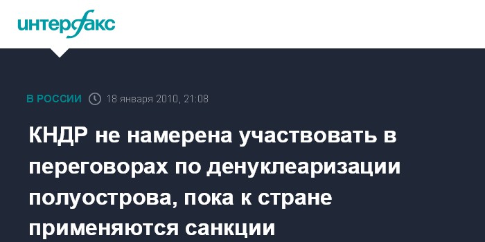 Лондон. 18 января. INTERFAX.RU - Северная Корея не вернется к переговорам по денуклеаризации Корейского полуострова до тех пор, пока не будут отменены санкции, введенные против Пхеньяна, сообщает в понедельник британская телерадиокорпорация BBC со ссылкой на заявление, опубликованное северокорейскими СМИ.