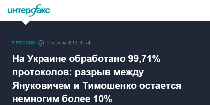 Киев. 19 января. ИНТЕРФАКС-УКРАИНА - По данным обработки 99,71% протоколов участковых избирательных комиссий, лидеру Партии регионов Виктору Януковичу на выборах президента Украины отдали голоса 35,37% избирателей, премьер-министру Юлии Тимошенко - 25,01%.