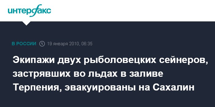 Южно-Сахалинск. 19 января. ИНТЕРФАКС-ДАЛЬНИЙ ВОСТОК - Вертолет "Ми- 8" компании "Авиашельф" завершил операцию по эвакуации моряков с двух сахалинских рыболовецких сейнеров "МРС-150-314" и "МРС-150-299", застрявших во льдах в южной части залива Терпения (восточное побережье Сахалина - ИФ).