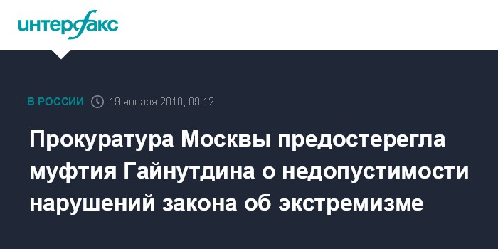 Москва. 19 января. INTERFAX.RU - "Предостерегаю председателя Духовного управления мусульман Европейской части России муфтия шейха Равиля Гайнутдина о недопустимости нарушения требований Федерального закона "О противодействии экстремистской деятельности", - говорится в предостережении, копия которого передана порталу "Интерфакс-Религия".