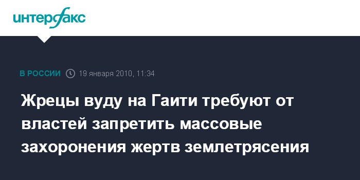 Москва. 19 января. INTERFAX.RU – Главный гаитянский жрец вуду Макс Бовуар призвал президента страны Рене Преваля положить конец практике захоронения жертв землетрясения в общих могилах.