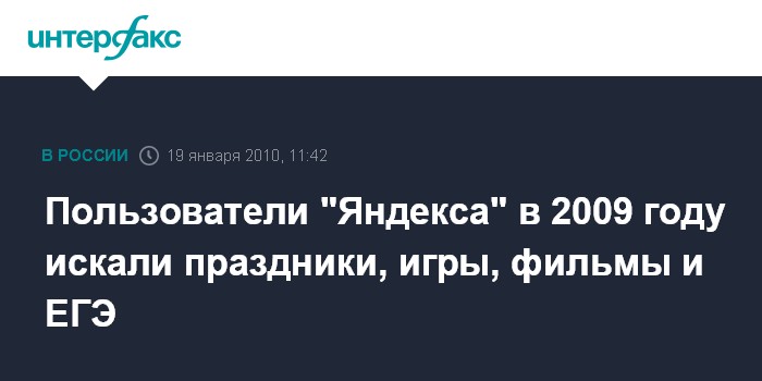 Москва. 19 января. INTERFAX.RU - Компания "Яндекс" обнародовала рейтинг самых популярных тем по поисковым запросам за 2009 год. Самым популярным поисковым запросом в топ-30 "Яндекса", как следует из поступившего в "Интерфакс" документа компании, стала тема "Новый год". Данный поисковый запрос был зафиксирован 20 900 600 раз. На второе место по уровню интереса вышла тема, связанная с образованием – запрос "Готовые домашние задания" за год был зафиксирован 9 086 600 раз, на третьем месте – "Евровидение" 2009 г. в Москве, которым пользователи интересовались 7 805 700 раз. В целом же рейтинг тем можно разделить на несколько групп. Пользователей интересовали всевозможные праздники (Международный женский день, День защитника Отечества, День святого Валентина, Рождество, День победы, Пасха, День знаний, День России, Первое мая, День учителя, Масленица – перечень в порядке убывания популярности темы), различные акции и массовые мероприятия (уже упоминавшееся "Евровидение" и Ночь музеев), фильмы ("Ледниковые период-3", "Каникулы строгого режима", "Аватар", "Форсаж-4", "Самый лучший фильм-2", "Трансформеры-2", "Ангелы и демоны" – перечень в порядке убывания популярности темы), компьютерные игры (GTA 4, The Sims 3, Dragon Age: Origins – перечень в порядке убывания темы). Отдельного упоминания заслуживает тема ЕГЭ, которая заняла в рейтинге четвертое место, интересовал пользователей поисковой системы и свиной грипп – данная тема заняла восьмое место рейтинга, запрос "цифровые наркотики" вышел на 21-е место. Единственной персоной, которая попала в тридцатку "Яндекса", стал скончавшийся в конце прошлого года Владимир Турчинский.