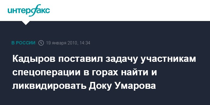 Москва. 19 января. INTERFAX.RU - В горных районах Чеченской республики по поручению Рамзана Кадырова началась спецоперация, перед участниками которой поставлена задача найти и нейтрализовать Доку Умарова и его ближайшее окружение. "Сегодня принято решение начать на всей горной территории - от Ножай-Юртского до Ачхой-Мартанского района - спецоперацию. В ней принимают участие подразделения МВД по ЧР, районные отделы внутренних дел, военнослужащие внутренних войск", - заявил Кадыров во вторник "Интерфаксу". Руководство операцией осуществляет Адам Делимханов.
