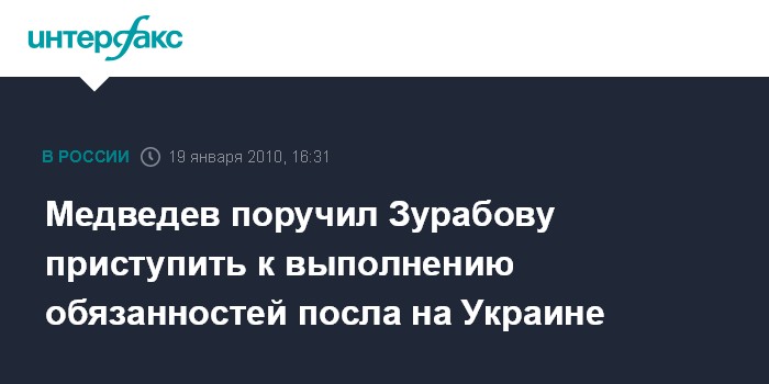 Москва. 19 января. INTERFAX.RU - Президент России Дмитрий Медведев дает послу России на Украине Михаилу Зурабову указание приступить к исполнению своих обязанностей и назначает его на должность спецпредставителя президента РФ по развитию торгово-экономических отношений с этой страной.