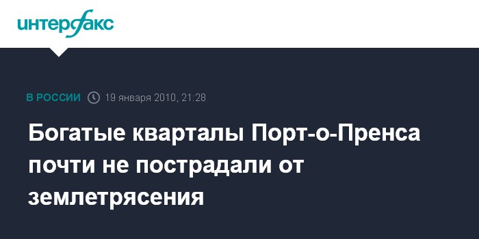 Мадрид. 19 января. INTERFAX.RU - Жители наиболее благополучных кварталов столицы Гаити, Порт-о-Пренса, практически не пострадали от недавнего землетрясения, пишет во вторник испанская газета Pais.