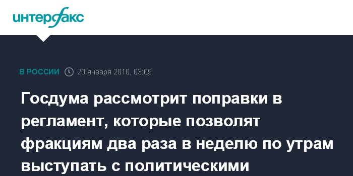 Москва. 20 января. ИНТЕРФАКС - Представители парламентских фракций в Госдуме скоро получат право выступать с пятиминутными политическими заявлениями в начале пленарных заседаний нижней палаты.