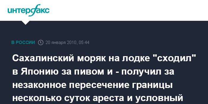 Южно-Сахалинск. 20 января. ИНТЕРФАКС - ДАЛЬНИЙ ВОСТОК - Житель Южно-Сахалинска 32-летний Алексей Вашкевич получил один год лишения свободы условно с испытательным сроком в 6 месяцев за свой незаконный "вояж" в Японию за пивом.