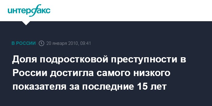 По его словам, в 2009 году уменьшилась и доля подростковой преступности в общей массе преступлений, достигнув самого низкого за последние 15 лет показателя - около 5,6%.