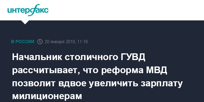 "Мы ожидаем увеличения (зарплаты - ИФ) в два раза", - сказал В.Колокольцев. По его мнению, это будет сделано "не только за счет сокращения аппарата, но и за счет других источников".