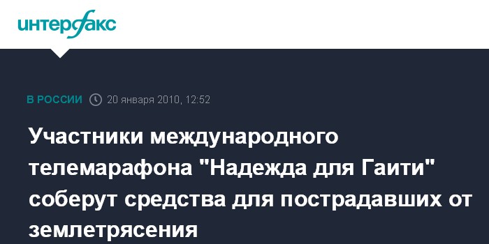 Москва. 20 января. INTERFAX.RU - В целях сбора средств для пострадавших во время землетрясения в Гаити будет проведен международный благотворительный телемарафон "Надежда для Гаити". В акции примут участие более 40 звезд, в том числе, Боно, Джастин Тимберлейк, Стинг, Кристина Агилера и Алишия Кис. Ведущим трансляции телемоста из Лос-Анджелеса станет известный голливудский актер Джордж Клуни, из Нью-Йорка – музыкант и гаитянец по происхождению Вайклеф Джин, с Гаити – специальный корреспондент Андерсон Купер. Вести трансляцию марафона будут десятки телеканалов, включая CNN International, MTV Networks International, National Geographic, ABC, CBS, NBC, FOX, CNN, HBO и другие. Прямой эфир состоится в ночь с 22 на 23 января в 4:00 по московскому времени, повтор - в ночь с 23 на 24 января в 1:30 по московскому времени.