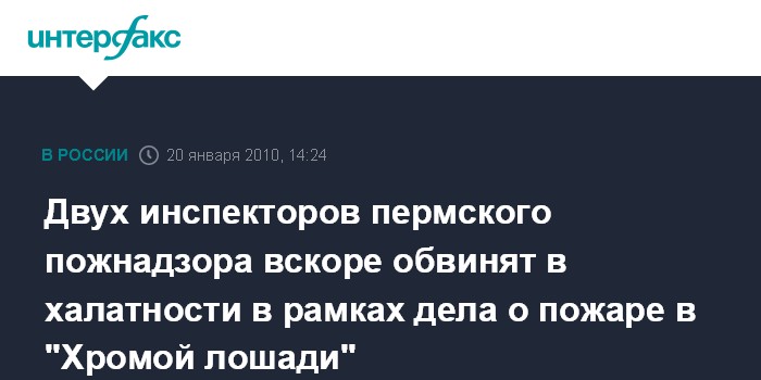 Москва. 20 января. INTERFAX.RU – В рамках дела о пожаре в пермском клубе "Хромая лошадь" будут предъявлены обвинения в халатности инспекторам местного Госпожнадзора Дмитрию Рослякову и Наталье Прокопьевой, сообщил "Интерфаксу" в среду официальный представитель СКП РФ Владимир Маркин.