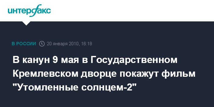 Москва. 20 января. INTERFAX.RU - В этом году в Государственном Кремлевском дворце (ГКД) начнется кинопоказ, первой станет демонстрация фильма режиссера Никиты Михалкова "Утомленные солнцем-2", сообщил управляющий делами президента Владимир Кожин. "Сегодня я присутствовал на предпросмотре одной вещи, которая будет претендовать на серьезное внимание российской публики и которую, я надеюсь, мы покажем в канун 9 мая в Государственном Кремлевском дворце", - заявил В.Кожин в прямом эфире радиостанции "Эхо Москвы" в среду. Впоследствии управделами уточнил, что ему демонстрировали фильм Никиты Михалкова "Утомленные солнцем-2".