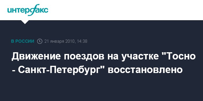 Москва. 21 января. INTERFAX.RU - ОАО "Российские железные дороги" (РЖД) восстановило движение пассажирских поездов на участке "Тосно -Санкт-Петербург", закрытое из-за происшествия на станции Колпино в пригороде северной столицы, сообщила пресс-служба РЖД.