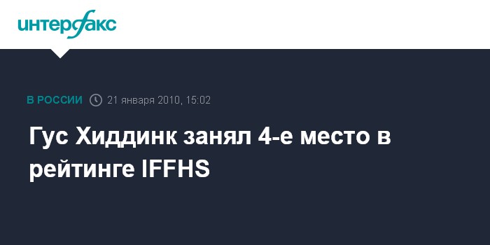 Москва. 21 января. INTERFAX.RU – Главный тренер сборной России по футболу Гус Хиддинк занял четвертое место в рейтинге лучших тренеров за период с 1996 по 2009 год по версии Международной федерации футбольной истории и статистики (IFFHS).
