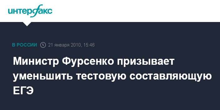 Москва. 21 января. INTERFAX.RU - В заданиях по Единому государственному экзамену (ЕГЭ) должно быть меньше тестов и больше вопросов, направленных на выявление творческих способностей школьников, убежден глава Минобрнауки Андрей Фурсенко. "В этом году вопросы по математике существенно пересматриваются - там уменьшается тестовая составляющая. И по другим предметам тоже мы должны уходить в вопросы, которые позволяют в большей степени выявить творческое начало", - сказал Фурсенко журналистам в Санкт-Петербурге, где прошло торжественное открытие Года учителя в РФ.