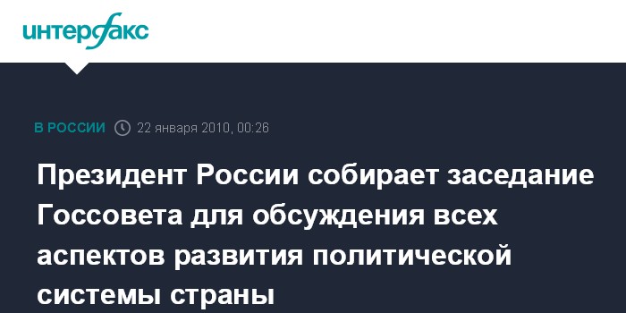 Москва. 22 января. ИНТЕРФАКС - Президент РФ Дмитрий Медведев проведет в пятницу в Кремле заседание Госсовета, посвященное развитию политической системы России.