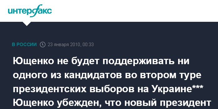 Киев. 23 января. ИНТЕРФАКС - Президент Украины Виктор Ющенко во втором туре голосования на президентских выборах не поддержит ни одного кандидата в президенты Украины.