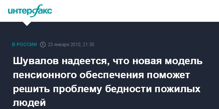 "Те решения по пенсионному обеспечению, которые были приняты и законодательно закреплены в прошлом году, означают следующее: с новой моделью пенсионного обеспечения в стране решается проблема бедности пенсионеров", - заявил И.Шувалов в интервью программе "Вести в субботу с Сергеем Брилевым" телеканала "Россия 1".