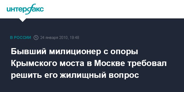 Москва. 24 января. ИНТЕРФАКС-МОСКВА - Бывший участковый милиционер ОВД "Перово" забрался на опору Крымского моста, откуда потребовал решить его жилищную проблему, сообщил "Интерфаксу" в воскресенье дежурный офицер группы оперативно-информационного реагирования столичного ГУВД Геннадий Богачев.
