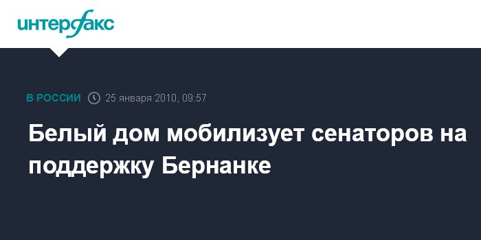 Москва. 25 января. INTERFAX.RU - Перспективы переназначения Бена Бернанке на пост председателя Федеральной резервной системы (ФРС), оказавшиеся под сомнением из-за популистской критики со стороны ряда сенаторов, улучшаются после вмешательства Белого дома, свидетельствуют данные американских СМИ.