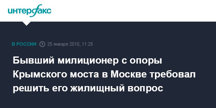 Москва. 25 января. INTERFAX.RU – Бывший участковый милиционер ОВД "Перово" забрался на опору Крымского моста, откуда потребовал решить его жилищную проблему, сообщил "Интерфаксу" дежурный офицер группы оперативно-информационного реагирования столичного ГУВД Геннадий Богачев. Он расскзал, что 45-летний мужчина забрался на опору, в руках у него был плакат с надписью: "Я - бомж, я живу здесь по решению суда.