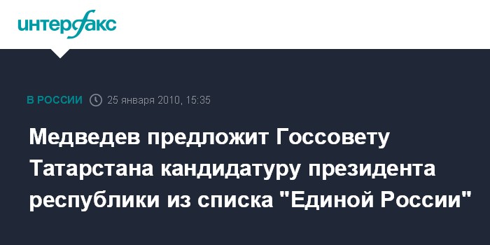 Москва. 25 января. INTERFAX.RU – Президент РФ Дмирий Медведев согласился со списком кандидатур, предложенных партией "Единая Россия" на должность президента Республики Татарстан, сообщила в понедельник пресс-служба Кремля.