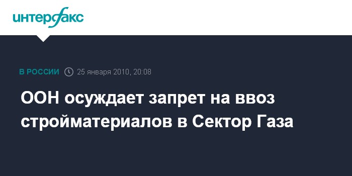 Женева. 25 января. INTERFAX.RU - В Израиле продолжает действовать жесткий запрет на ввоз материалов, необходимых для восстановления Cектора Газа, пострадавшего в результате израильской операции "Расплавленный свинец" в 2008 г., констатировал в понедельник глава Ближневосточного агентства ООН для помощи палестинским беженцам (БАПОР) Джон Гинг.