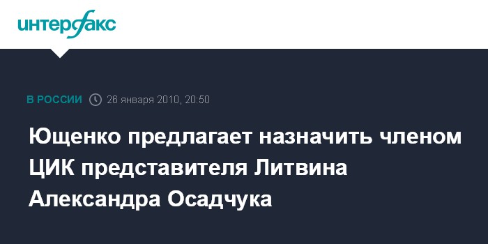 Киев. 26 января. INTERFAX.RU - Президент Украины Виктор Ющенко предлагает назначить членом ЦИК представителя лидера Блока Литвина Александра Осадчука.