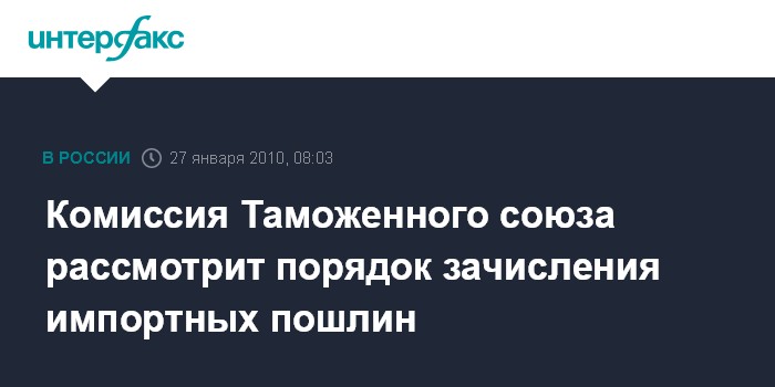 Как сообщалось, импортные пошлины, собираемые в рамках функционирования Таможенного союза, планируется аккумулировать на едином счете России, Белоруссии и Казахстана. Затем, после выверок балансов, счета планируется перераспределять между странами. Предполагается, что на долю России будет поступать не менее 90% импортных пошлин, Казахстана - 6-7%, Белоруссии 3-4%.